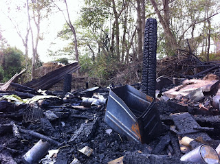 On Thursday night our allotment shed was burnt to the ground. The fire was so fierce that neighbours called the fire brigade who had to stumble through woodland to put out the blaze and stop our Saxon roundhouse from also catching fire.
