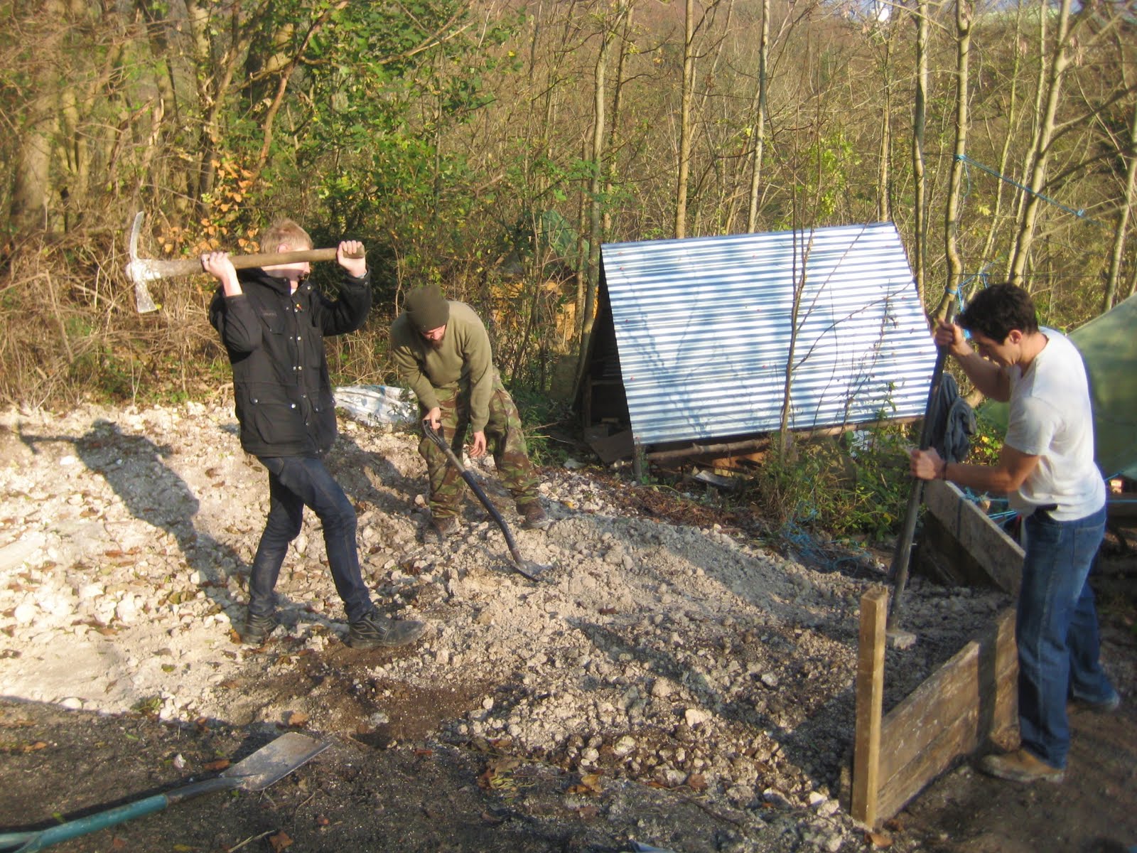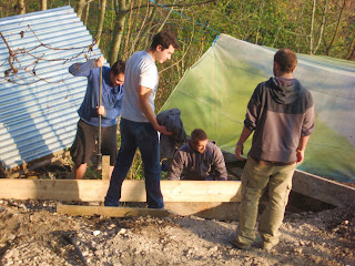 The clear up is over and people have started work on our temporary structure. We need to put something up quick to have somewhere dry and warm before the weather turns cold. Unfortunately our half built rammed chalk food larder (see top picture) has had to be buried alive while people pick axed and flattened a large area of chalk next to the old shed. We laid down scaff board for supporting walls while we try to even up the ground.