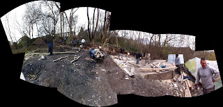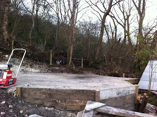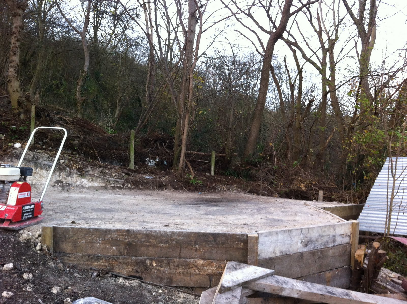The chalk floor on the temporary structure is finished thanks to hard labour and a pounder. The A frame is being built and the support struts will be up soon. The council are going to put up a new fence at the back and to save the council money we are moving along the back line, bashing out old concrete posts, removing tangled fencing, tree stumps, rubbish, old shoes, glass and cow bones.